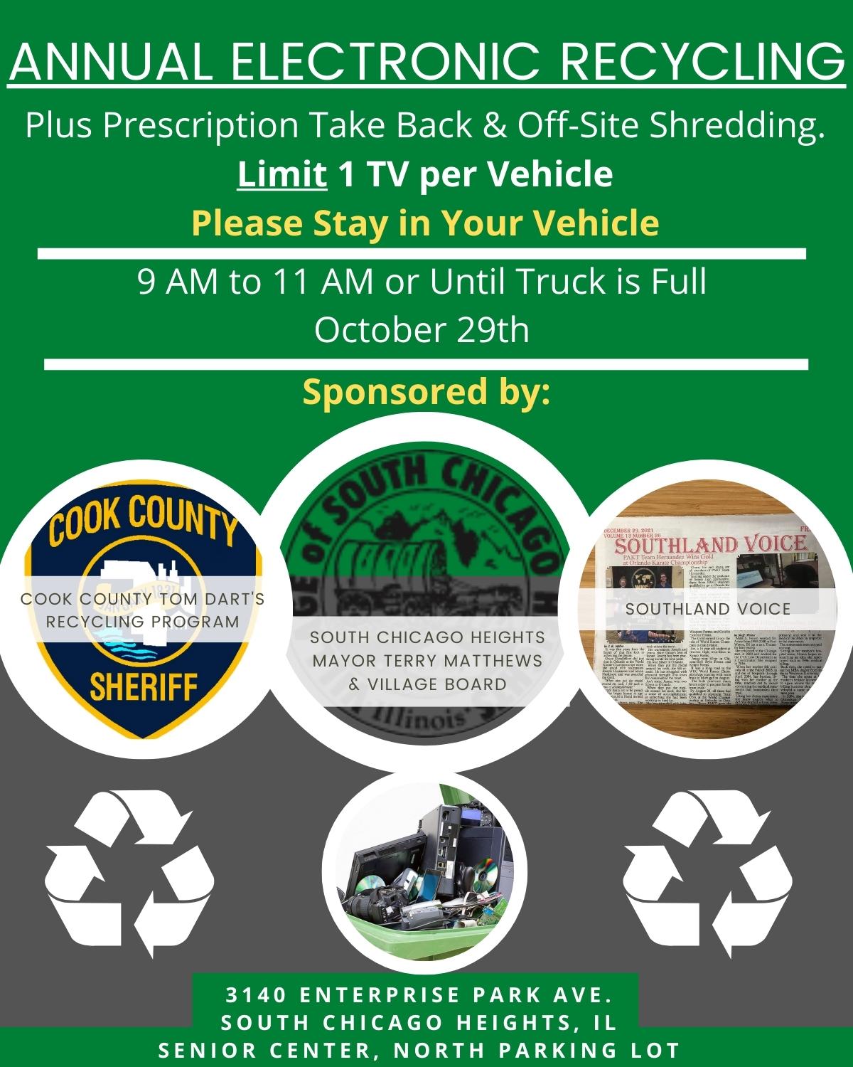 Join us for Electronic Recycling and prescription take back along with off-site shredding. To be held on October 29, 2022 form 9:00 am to 11 am or until the truck if full. This is sponsored by "Cook County Sheriff", "Village of South Chicago Heights", and "Southland Voice". The location is 3140 Enterprise Park Avenue, South Chicago Heights.
